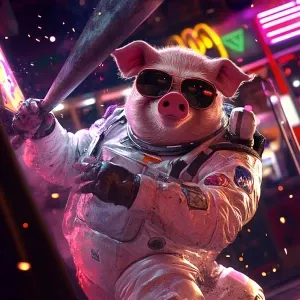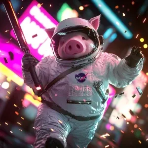 «Cartoonish realistic pig in vintage white NASA style closed spac...»