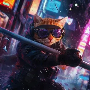 «Stylized portrait of a masked street cat wearing a sleek black t...»