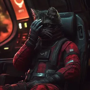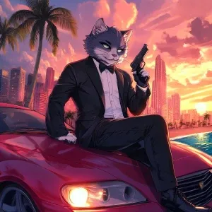 «A humanoid cat character with sleek, silver fur, dressed in a st...»