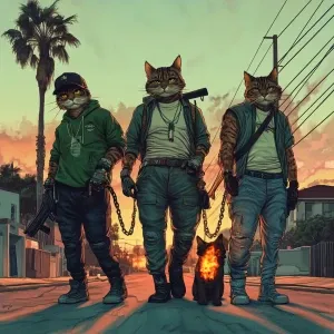 «Three humanoid cats standing on a suburban street. The cat on th...»