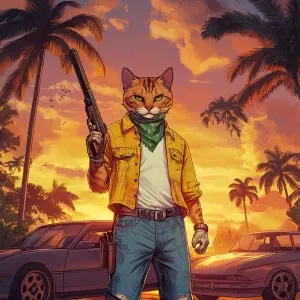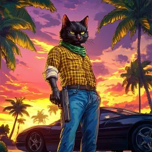 «Two humanoid cats engaged in a dramatic shootout, depicted in an...»