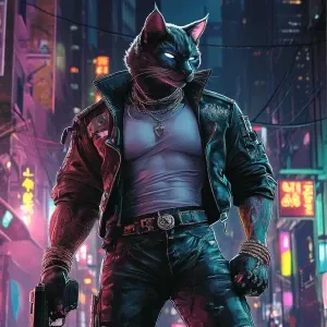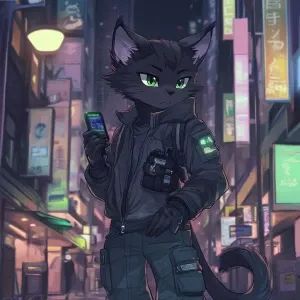 «A humanoid cat character stands in a bustling cityscape at night...»
