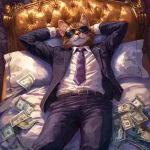 «Create an image of a humanoid cat character lying on a luxurious...»