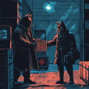 «A shady cat in a trench coat exchanging a briefcase with another...»