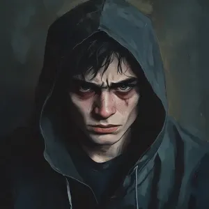 «a pale, depressed-looking man with sunken eyes and hoodie, blank...»