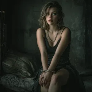 «“A 40-year-old sad woman sitting quietly beside a window, soft n...»