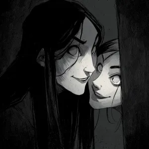 «Create a chilling scene with a ghostly woman leaning impossibly...»
