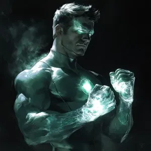 «a stoic figure with glowing crystalline hands, clenched fists, u...»