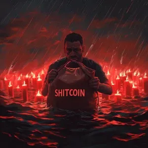«man holding a heavy bag labeled "SHITCOIN" while drowning in a s...»