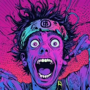 «a wide-eyed, manic man with wild hair and huge pupils, open-mout...»