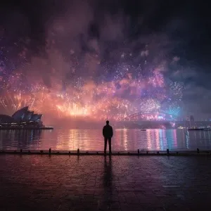 «A man standing on a crowded Sydney Harbour promenade, surrounded...»
