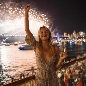 «A woman joyfully standing on a crowded Sydney Harbour promenade,...»