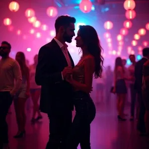 «Generate an image of a stylish couple dancing at a neon-lit part...»