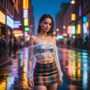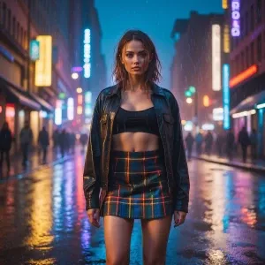 «woman with wet hair glowing in city lights, wearing a tartan min...»