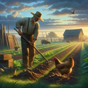 A rustic farm at dawn bathed in soft golden sunlight....»