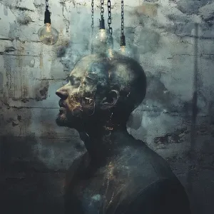 «"Create a highly detailed, surreal portrait of a man in a neglec...»
