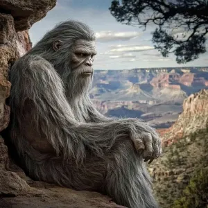 «A humanoid looking grey haircovered sasquatch with a matted bear...»