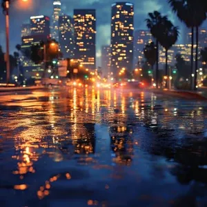 «Create an image of Los Angeles in the evening after rainfall, wi...»