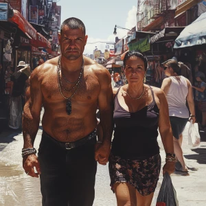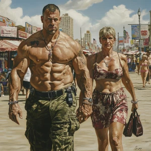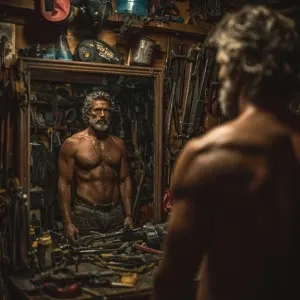 «Generate an image depicting a muscular, weathered handyman stand...»