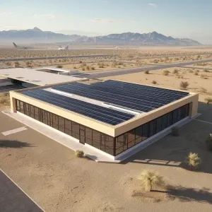 «Modern low-rise airport terminal building with solar panels cove...»