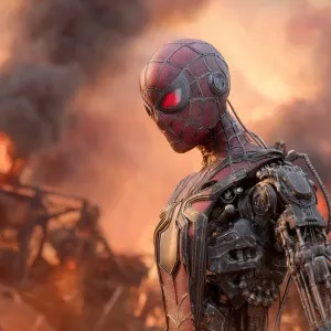 «T-800 Spider-Man, apocalyptic futuristic background»