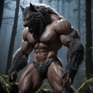 «In a moonlit forest clearing, visualize a towering lycan showing...»