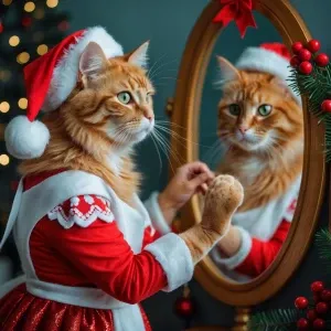 «Une jolie chatte rousse essaie un costume de noel»