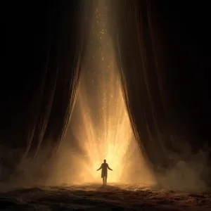 «Cinematic inspirational scene of a lone figure standing before m...»