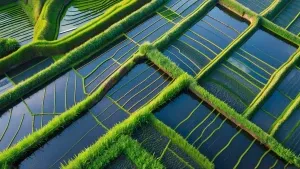 «38. Overhead view of paddy terraces with water reflections, deta...»