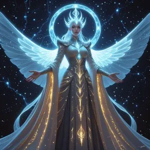 «In a shimmering astral projection, a majestic figure radiates bi...»