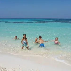 «give me a real pictures of 5 kids playing with water in a turquo...»