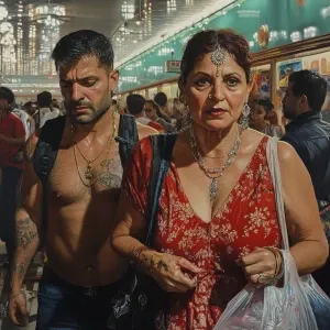 «Photorealism.A sweaty beefy man walking with his 54 year old kas...»