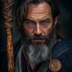 «White muscular thin man with beard, big chin, smile and cheekbon...»