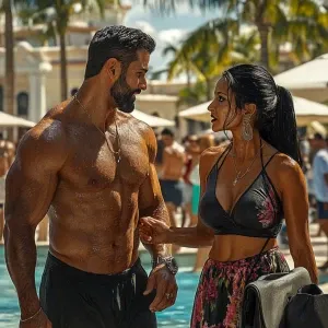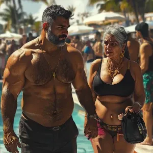 «PhotoRealism,realism,a muscular beefy sweaty man walking with h...»
