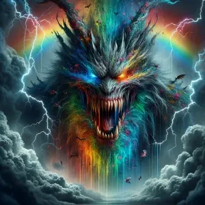 «Double exposure horror thunderstorm rainbow entity, in the style...»
