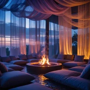 «Twilight Veil Lounge: A cocoon of calm and color, the lounge glo...»
