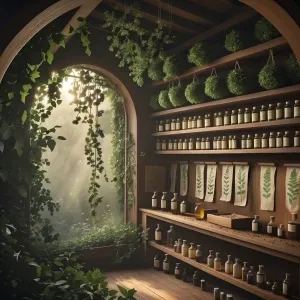 «In a hidden herb apothecary, concealed behind a curtain of ivy a...»
