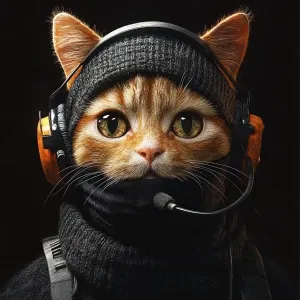 «A wide-eyed ginger cat wearing a black tactical balaclava (or ma...»