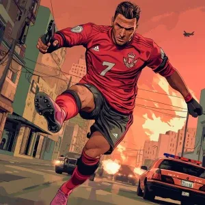 «A muscular male soccer player with short, dark hair, wearing a r...»