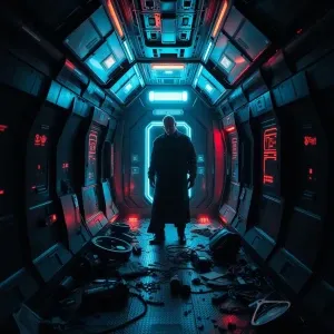 «In the dimly lit confines of a cyberpunk starship brig, a figure...»