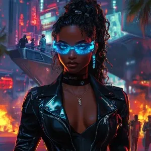«A futuristic female character with dark skin, styled in volumino...»
