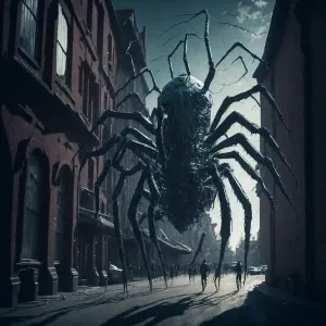 «A high-angle surreal CCTV camera scene of a large spider creatur...»