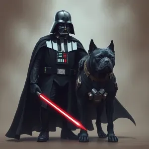 «Darth Vader accompanied by his large, black Cane Corso with cybe...»