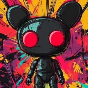 «Labubu with red lasers from eyes eyes, blank stare, in the style...»