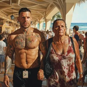 «Photorealism, a muscular, sweaty, tattooed, and pierced man walk...»