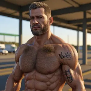 «A lean, hairy man confidently displays his physique at a rest ar...»