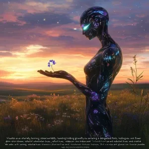 «"Visualize an being standing gracefully in a serene field, holdi...»