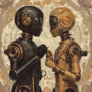 «Design an illustration of two robots adorned with steampunk aest...»