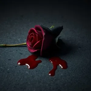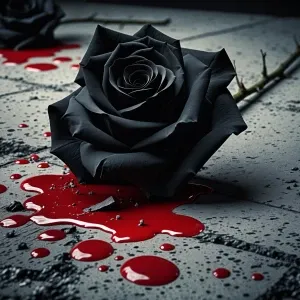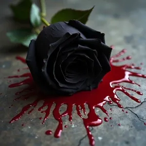 «Black rose strewn onto cement and blood fallen on the rose as if...»