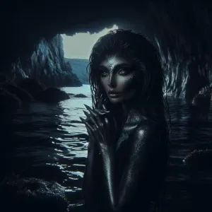 «In the shadowy depths of a murky seaside cave, a sultry bewitchi...»